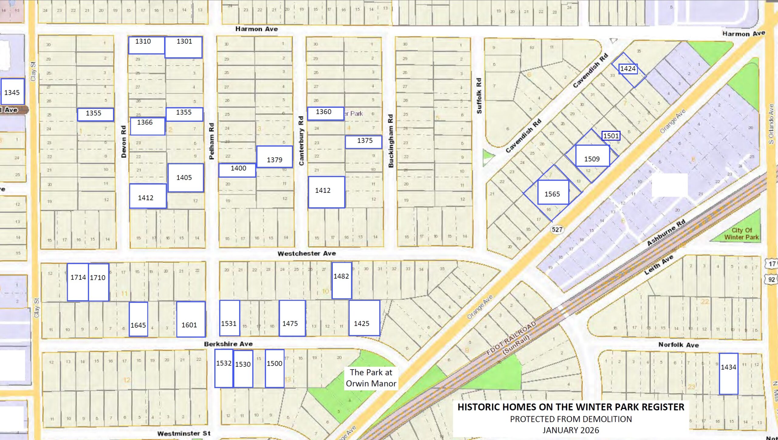 Winter Park has many homes listed on the Winter Park Historic Register. In Orwin Manor Westminster, we are very proud of the many in our neighborhood as we save the charm. We also have the grand entry gates, which were designated as an Orlando Landmark in 1989.